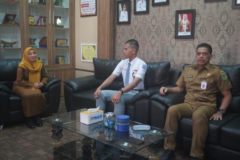 Sebelum berangkat ke Jakarta, M Naufal Farrel Aqil pelajar SMA Negeri 1 Kusan Hilir di dampingi Kepala Badan Kesatuan Bangsa dan Politik (Kesbangpol) Tanah Bumbu, Nahrul Fajeri, menemui Pj Sekda Yulian Herawati.