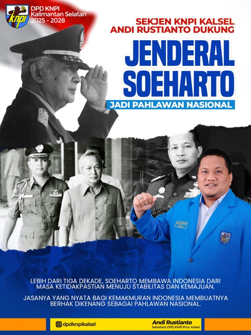 BANJARMASIN, Goodnews.co.id – Sekretaris DPD KNPI Kalimantan Selatan, Andi Rustianto mendukung wacana pemberian gelar Pahlawan Nasional kepada Presiden ke-2 Republik Indonesia, H. M. Soeharto. Alasannya jasa Soeharto membangun dan menstabilkan bangsa Indonesia tidak bisa dihapus dari catatan sejarah nasional.