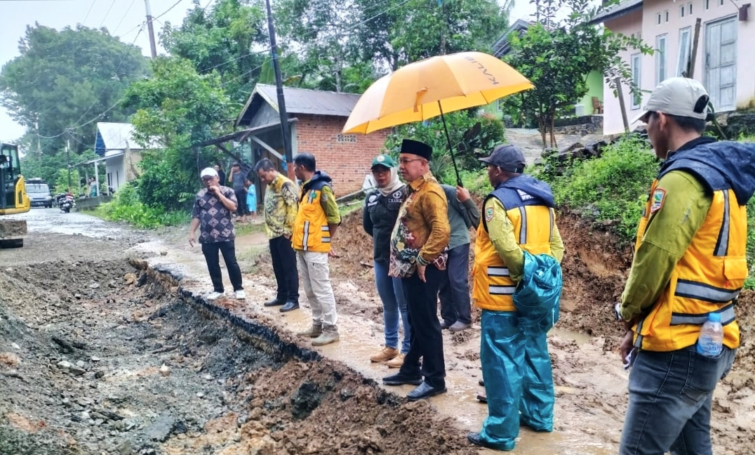 Meski diguyur hujan rintik, Bupati Kotabaru Sayed Jafar berjalan kaki meninjau jalan amblas di ruas jalan Desa Gunung Sari, didampingi Kepala Dinas Pekerjaan Umum dan Penataan Ruang (PUPR) Kotabaru Dr. Ir. Suprapti Tri Astuti. ST., MT.