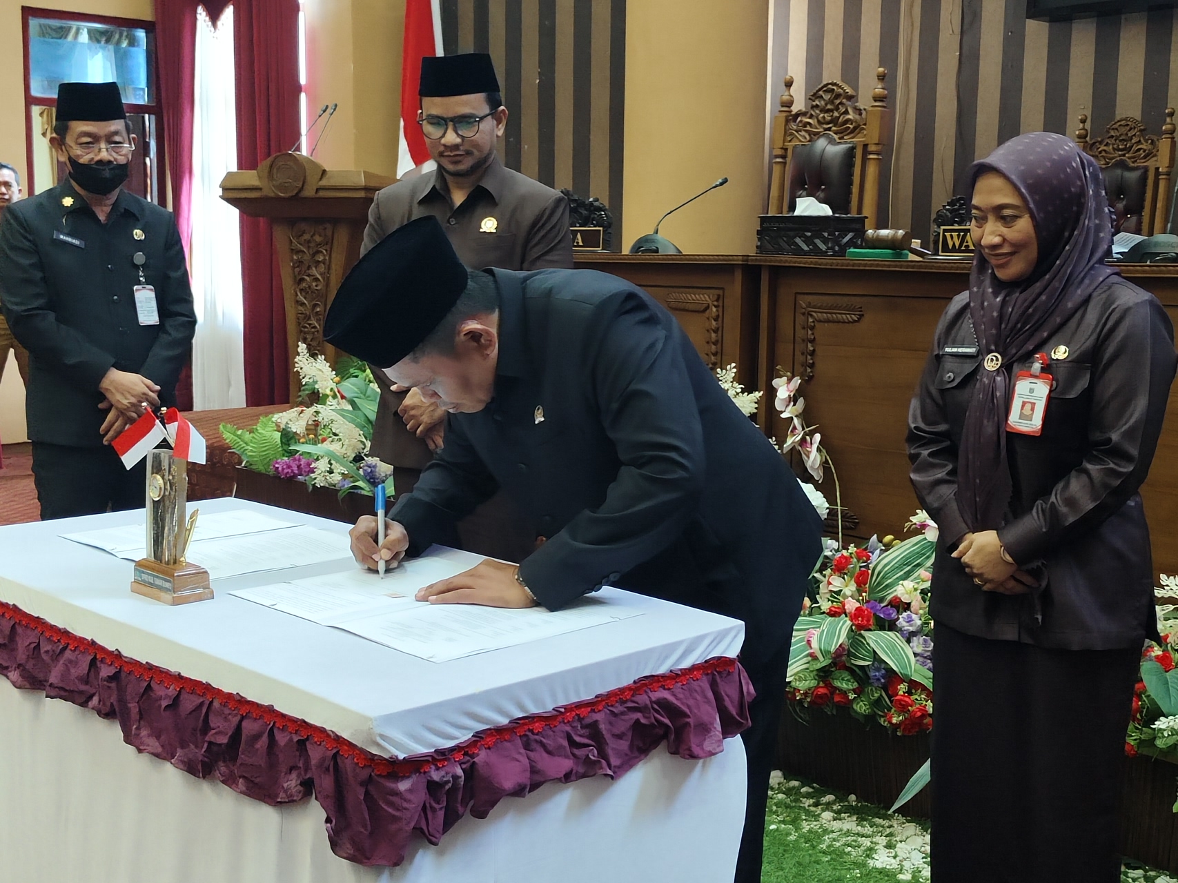 Usai menyampaikan sambutan Bupati, Unsur pimpinan DPRD Tanah Bumbu bersama Pj Sekda Yulian Herawati menandatangani berkas Nota Kesepakatan KUA PPAS Tahun Anggaran 2026.