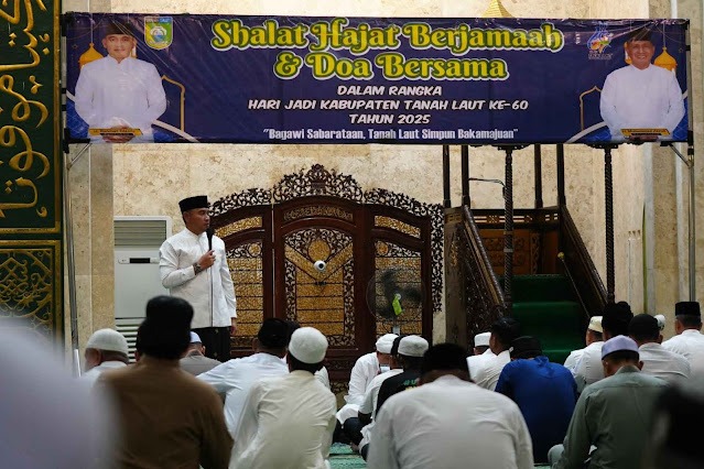 TANAH BUMBU, Goodnews.co.id – Pemerintah Kabupaten Tanah Laut (Tala) menggelar kegiatan Shalat Hajat berjamaah dan do’a bersama dalam memperingatiHari Jadi (Harjad) Tala ke-60 di tanggal 2 Desember 2025, kegiatan ini berlangsung di Masjid Syuhada, Senin (1/12/2025) malam.