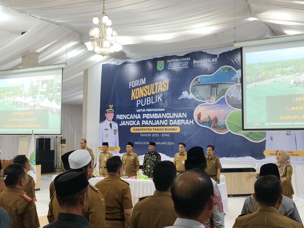 Forum Konsultasi Publik dalam menyusun Rancana Pembangunan Jangka Panjang Daerah (RPJPD) Kabupaten Tanah Bumbu Tahun 2025-2045, dihadiri Bupati Tanah Bumbu, Pejabat, ormas, dan tokoh masyarakat.