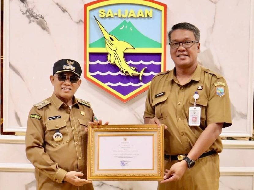 Kemudian Sonny menyerahkan piagam penghargaan tersebut kepada Bupati Kotabaru di ruang kerja Bupati pada hari Senin, (1/9/2025).