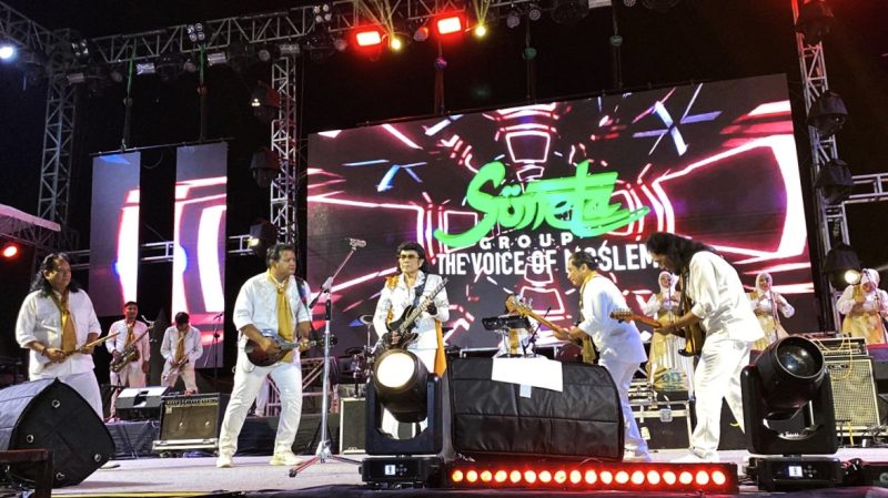 Suasana semakin semarak ketika H Rhoma Irama naik ke atas panggung, disambut riuh tepuk tangan dan sorakan penonton.