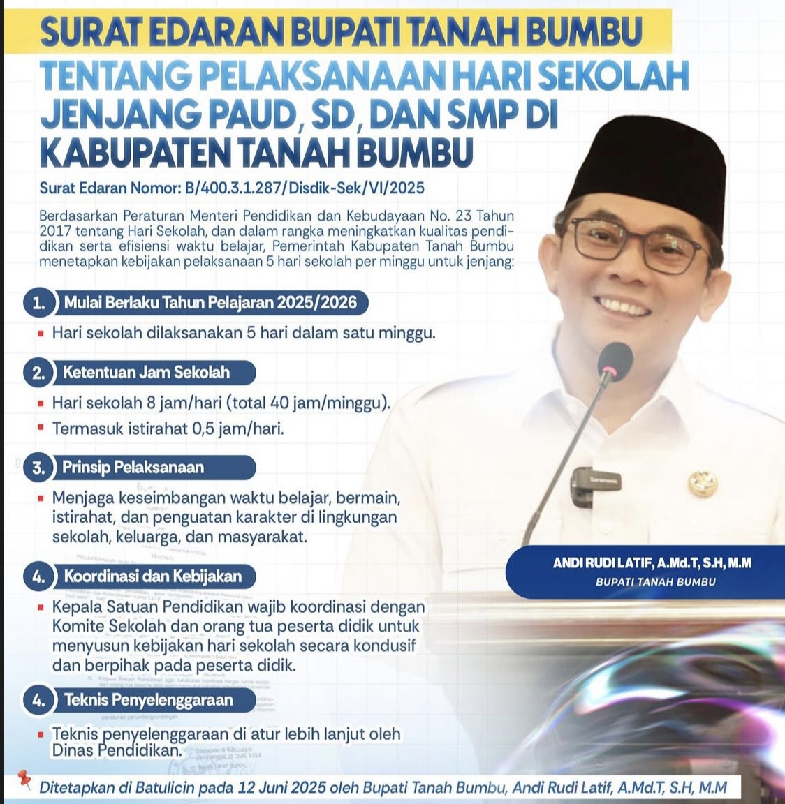 Hal Ini berdasarkan Surat Edaran (SE) Nomor: B/400.3.1.287/Disdik-Sek/VI/2025 Bupati Tanah Bumbu tentang Pelaksanaan Hari Sekolah Jenjang PAUD, SD, dan SMP di Kabupaten Tanah Bumbu.