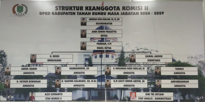 Dalam struktur baru, Koordinator Komisi II tetap Andren Atma Maulani, Andi Erwin Prasetya menduduki Ketua sementara anggota DPRD senior Parman berada pada posisi Wakil Ketua. Selanjutnya posisi baru Sekretaris dijabat Zainal Abidin, Bendahara diisi Rusdi.