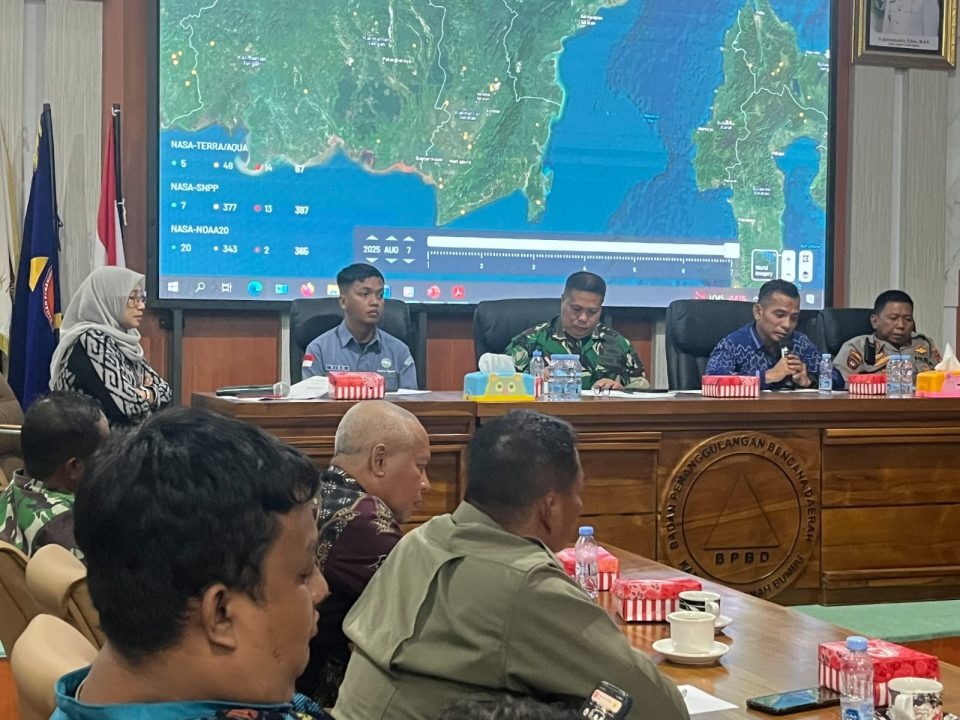 Rapat Koordinasi (Rakoor) kesiapsiagaan menghadapi bencana Karhutla digelar di Kantor Pusdalops Badan Penanggulangan Bencana Daerah (BPBD) Tanah Bumbu (Tanbu) , Kamis (7/8/2025).
