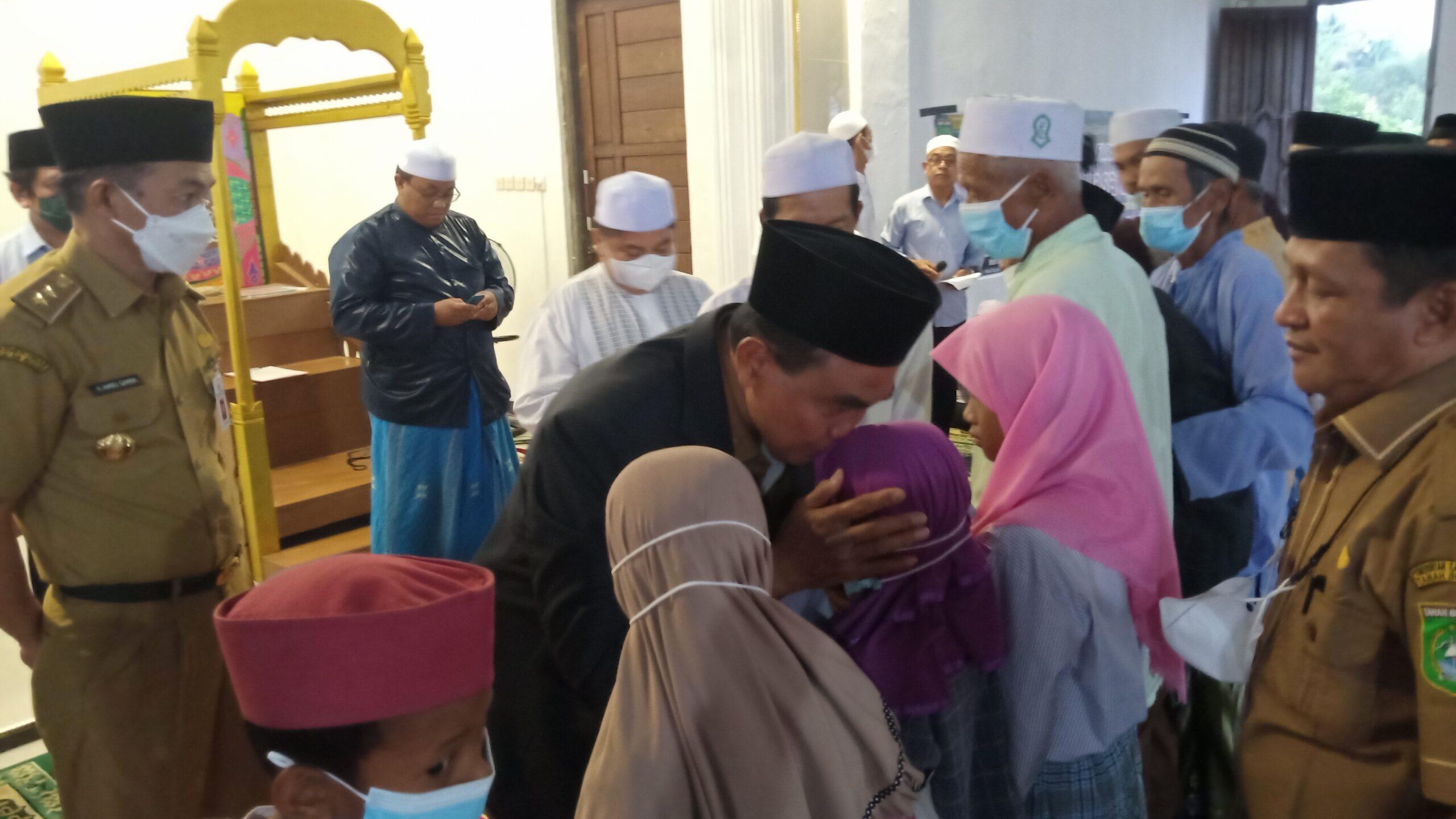 Disela-sela kegiatan Safari Ramadhan, Bupati Tanah Bumbu, Zairullah Azhar, menyerahkan bantuan dan santunan kepada anak yatim dan orang tua jompo. (MAS)